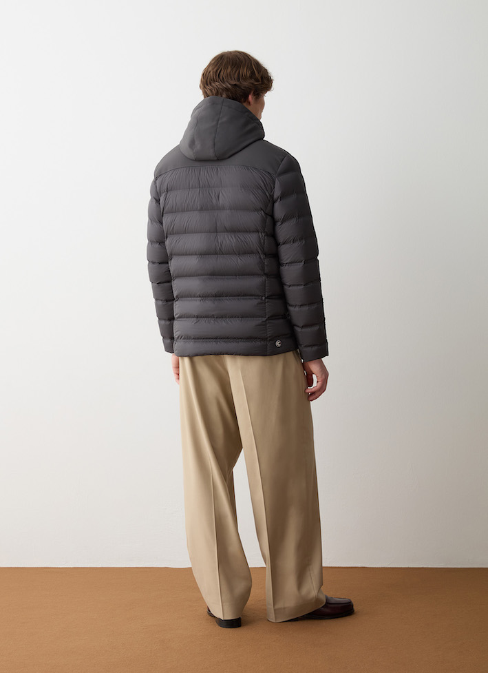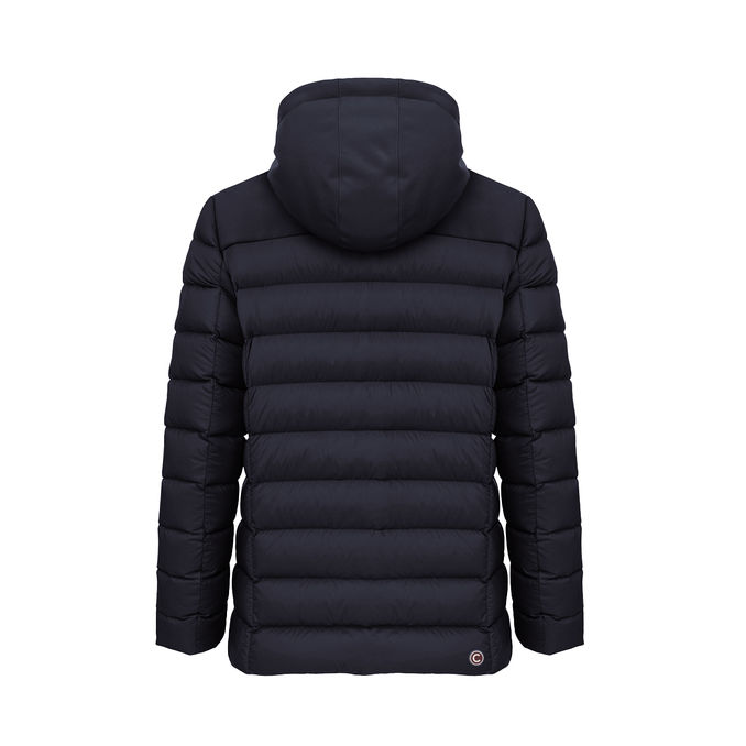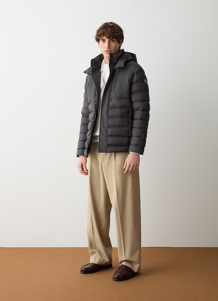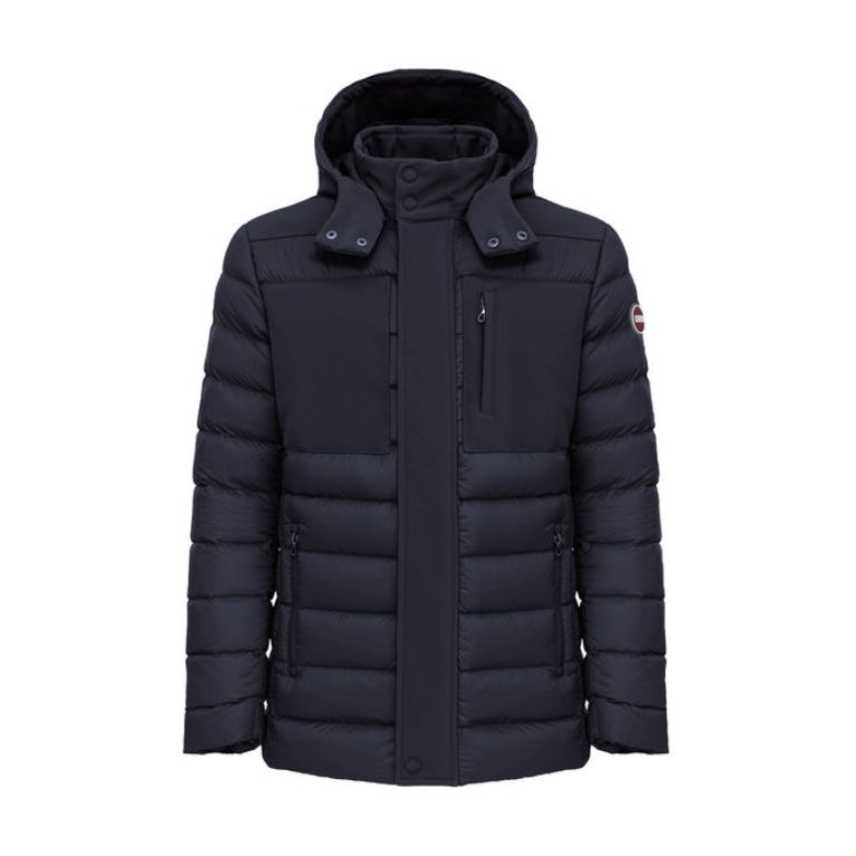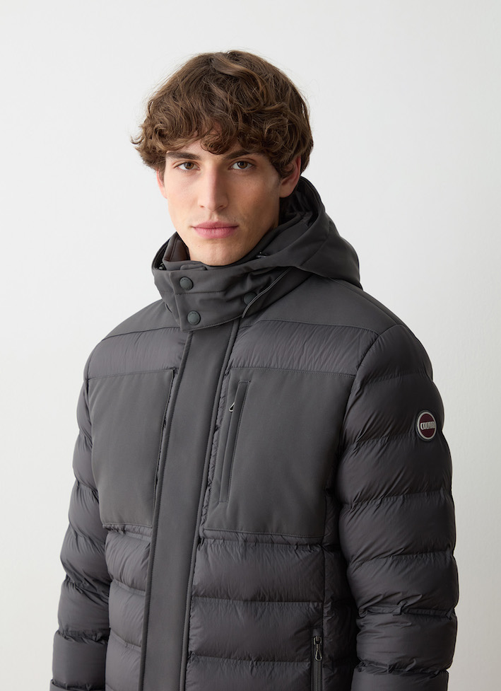 Giacca da uomo con cappuccio staccabile in morbido tessuto tubico in poliammide semi-lucida con finissaggio idrorepellente eco-sostenibile e trattamento anti-piuma. Il carré, il cappuccio e parte del busto, sono realizzati in tessuto stretch effetto scuba, anch'esso con trattamento idrorepellente. Un modello di carattere che mixa eleganza e tecnicità. Un insieme ben calibrato di materiali, sapientemente dosati dal know how di Colmar Originals.