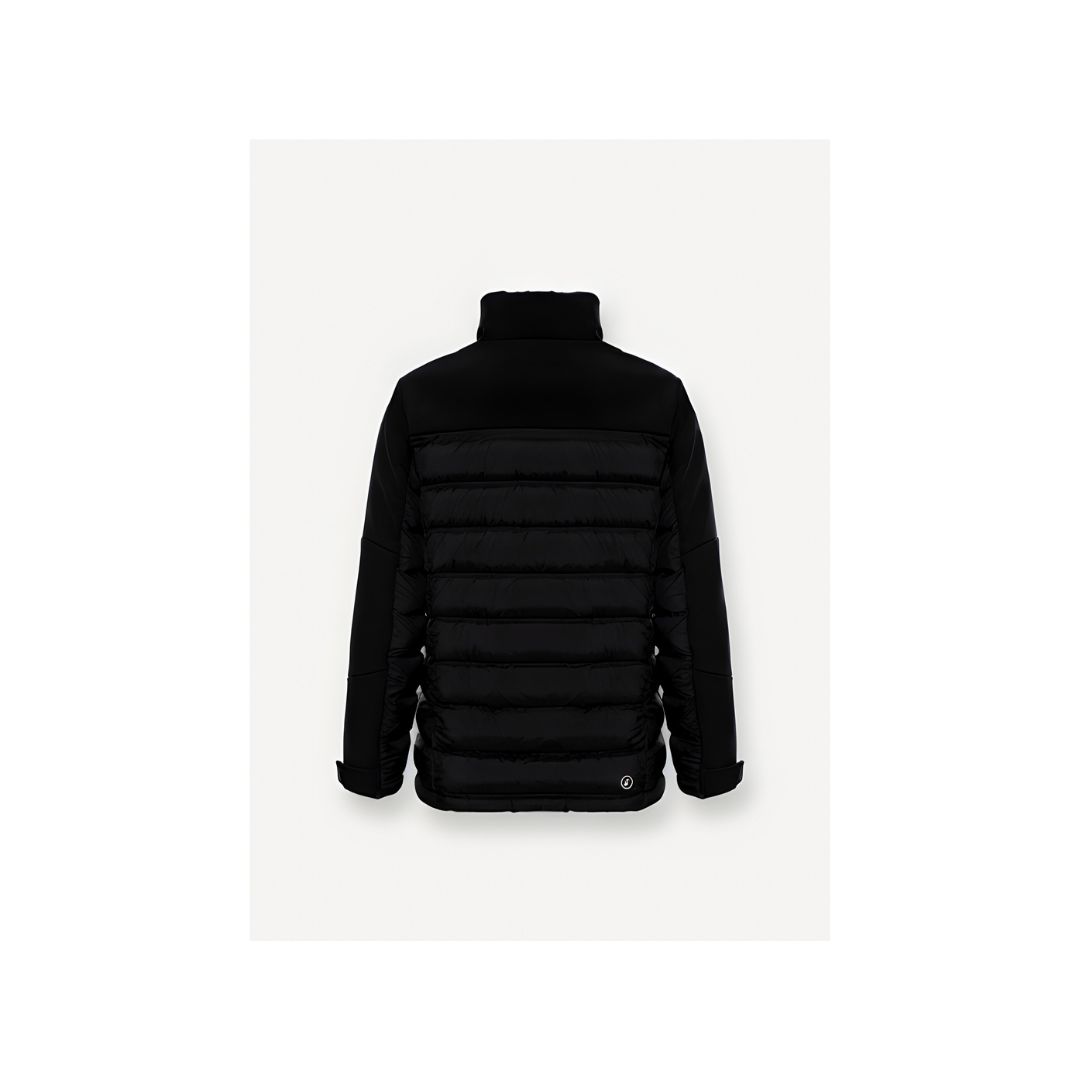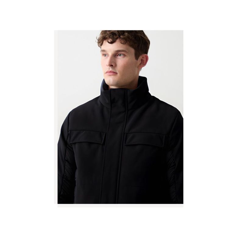 Giacca da uomo in morbido tessuto tubico in poliammide semi-lucida con finissaggio idrorepellente eco-sostenibile e trattamento anti-piuma. Il carré, parte delle maniche e del busto, sono realizzati in tessuto stretch effetto scuba, anch'esso con trattamento idrorepellente. Una nuova Field jacket dall'anima sportiva che unisce eleganza e tecnicità.