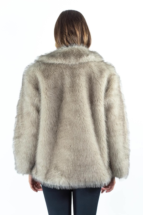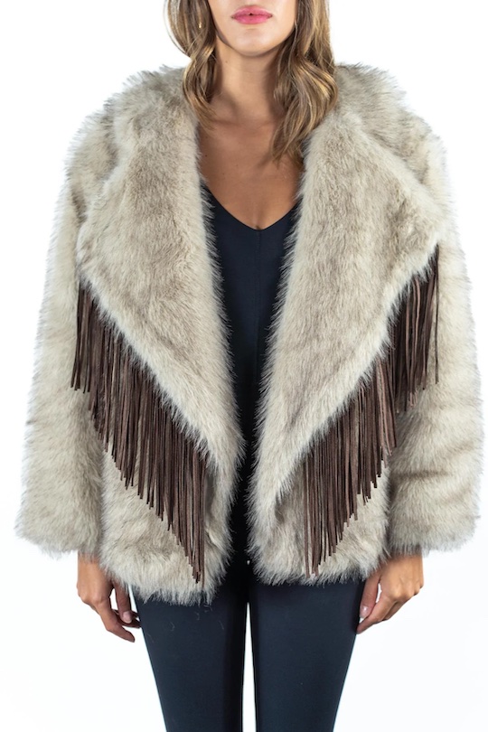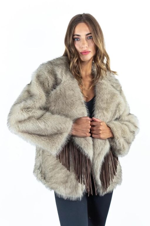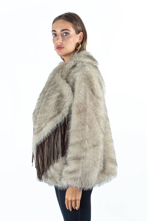 Finta pelliccia beige con frange in alcantara marroni rimovibili tramite zip (chiusura con ganci).