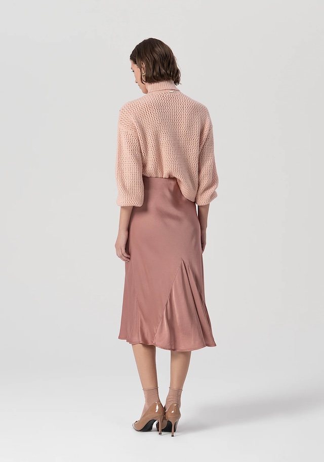 Gonna flare midi in raso, vita regolare, e con taglio asimmetrico sul dietro.